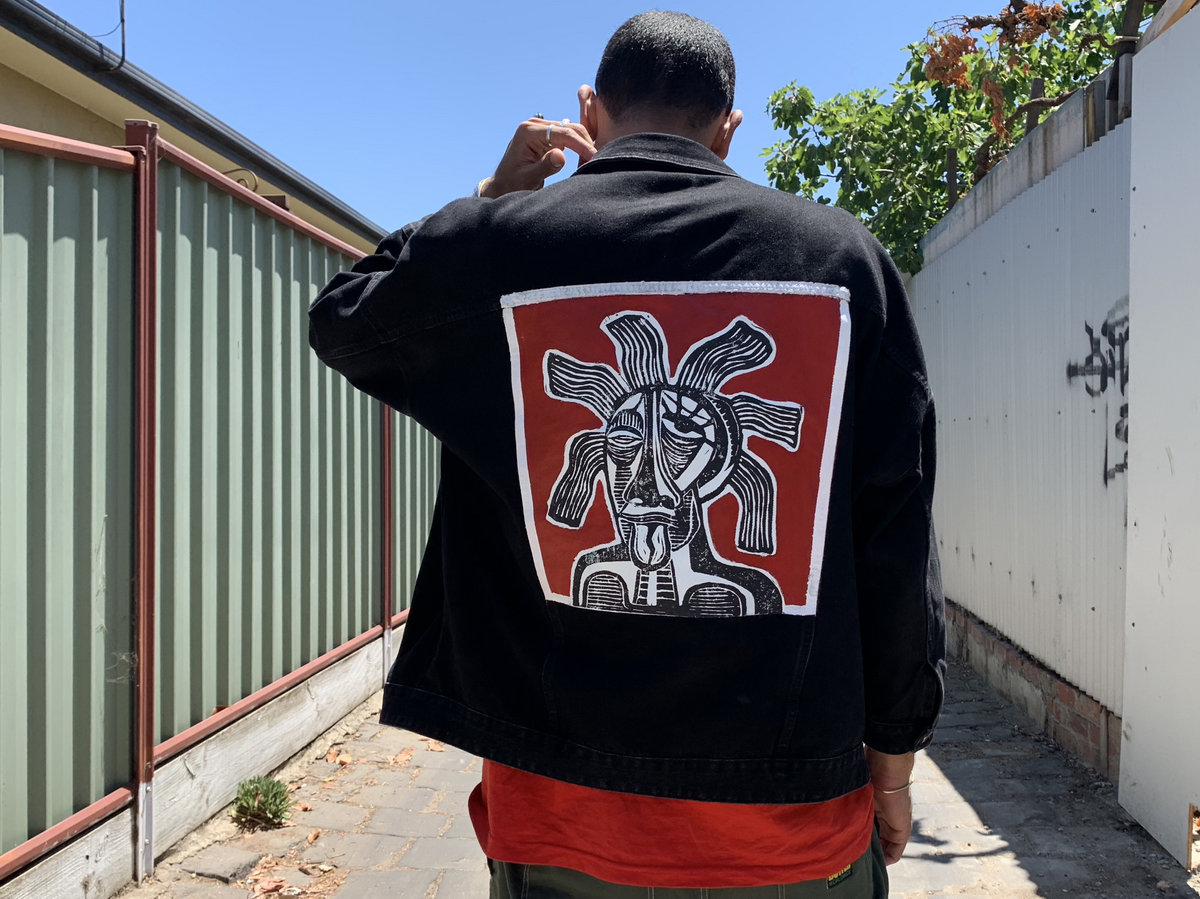 "War is Raw" A.Kid artwork on vintage black Denim Jacket. Limited edition of 5, hand-pressed woodblock print.